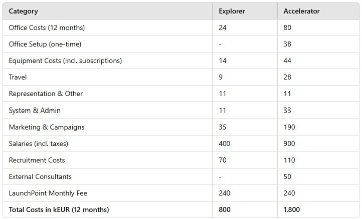 Explorer: Designed for businesses with a leaner setup, including 2 employees and a co-working office solution. Total cost: 800 KEUR